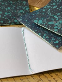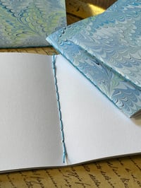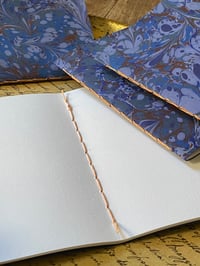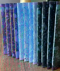 These handbound marbled notebooks have been created using original hand marbled paper from my Shades of Blue marbled paper collection. The exposed chain stitch spine was made using waxed linen thread in an assortment of colors.