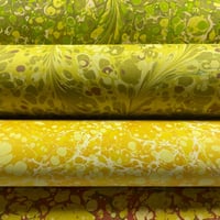 These sheets are contemporary marbled designs on Chartreuse Colorplan Paper (135gsm). They measure 12.5x19 (long grain), a size that is ideal for smaller projects. Each sheet is one of a kind and marbled using acrylic paints.
